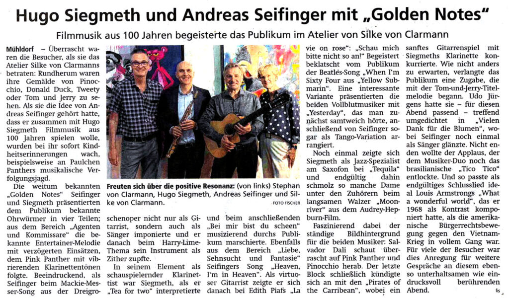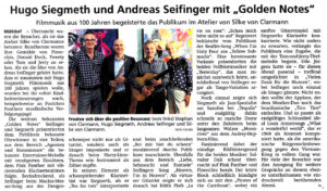 Mit Spielwitz und Liebe zum Detail gehen Hugo Siegmeth und Andreas Seifinger im Duo „Golden Notes“ auf große Reise durch die Welt der Filmmusik. Farbenreich in der Kombination aus Saxophon, Klarinette und Flöte mit Gitarre und Gesang spüren die Beiden den Originalen nach und lassen diese in neuem Glanz erscheinen. So zu hören in ausgefeilten Arrangements von „Fluch der Karibik“ oder „Die fabelhafte Welt der Amelie“.