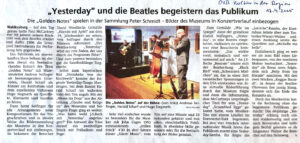 1965 war ein besonderes Jahr in der Pop-Musikgeschichte. Die Beatles veröffentlichten mit „Yesterday“, aus der Feder von Paul McCartney, den meistgecoverten Song aller Zeiten, erschienen auf dem Beatles-Album „Help“. 11 Wochen belegte der Hit in den USA Platz eins in den US-Charts. Im Sommer 1966 gingen die „Fabulous Four“, u.a. mit „Yesterday“ auf der Setlist, letztmalig auf Tournee. Ein Konzert fand dabei im Circus Krone in München statt. In den Folgejahren widmeten sich die Beatles ausschließlich der Studioarbeit und produzierten dabei unvergessene Hits, wie Michelle, Norwegian Wood, Yellow Submarine, When I´m 64, Penny Lane, All You need is Love, Blackbird oder Let it be.