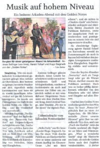 Die Golden Notes fügen diesen Versionen nun noch ein paar Variationen hinzu und kleiden das „Starmodel Yesterday“ in Outfits unterschiedlichster Musikstile. Diese reichen von eleganten Standardtänzen, wie Walzer, Tango oder Samba über fast festivaltaugliche Versionen, wie Reggae, Rock und Funk bis hin zu höfischen Gewändern im Stile von Mozart und Großmeister Johann Sebastian Bach. Ein Ausflug in die bayerische Stubenmusik darf hierzulande natürlich auch nicht fehlen – ein facettenreicher Abend, nicht nur für Beatles Fans.