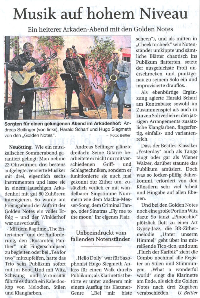 Mit „Golden Notes“ haben sich Hugo Siegmeth und Andreas Seifinger der einzigartigen Klangkombination aus Saxophon, Klarinette und Flöte mit Gitarre und Gesang verschrieben. Sie servieren ausgefeilte Arrangements weltbekannter Hits der letzten 100 Jahre. Machen Sie Ihre Feier zu einem glanzvollen Fest mit den Golden Notes – große Hits fein gespielt.